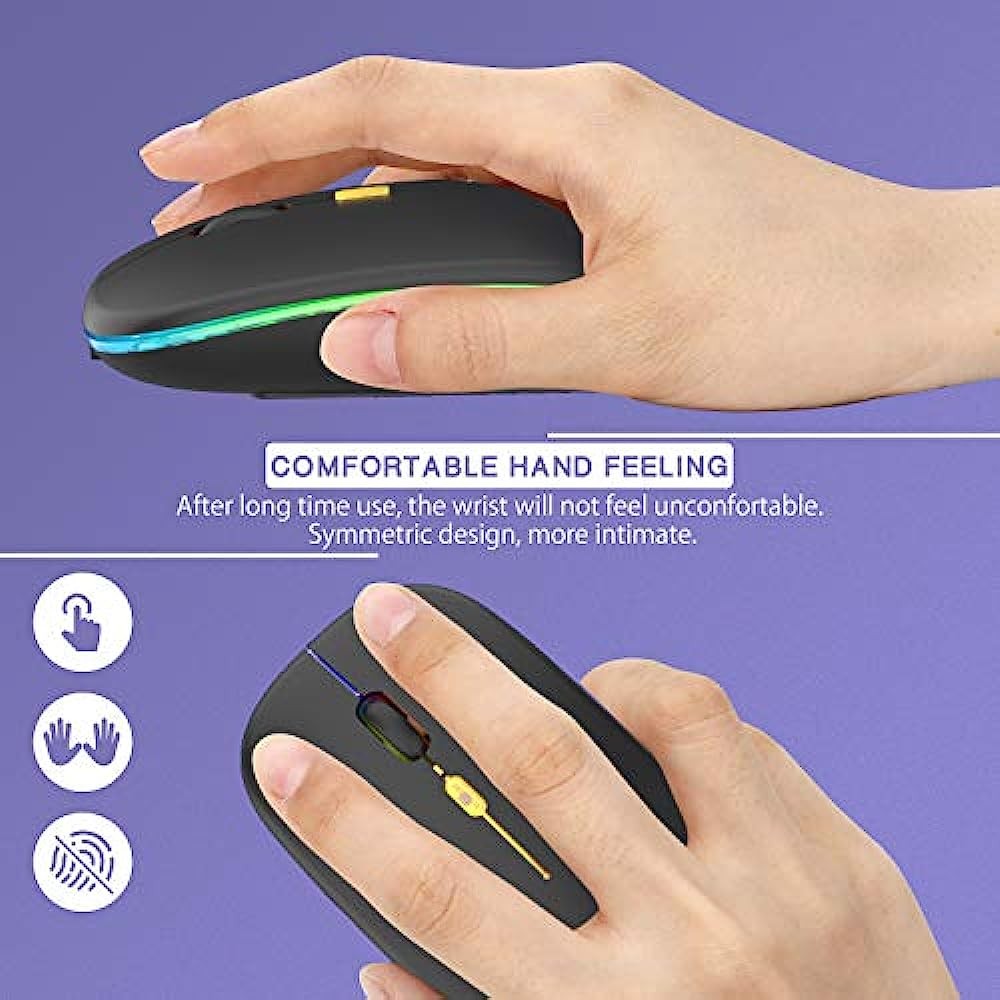 to the boring office life. The bottom of the mouse has a switch, you can switch lights freely. Low-key or sparkle, switch in one second, suitable for any occasion. 【 Rechargeable Optical Mouse 】 Built-in durable rechargeable battery, it can be easily charged using the included USB cable without replacing the battery. Just 2 hours charging you can use it about 7-5 days. Standby time is very long.